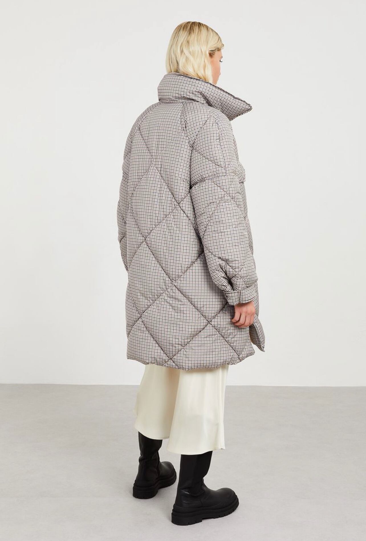 ツイード調のプリント生地を使用したウォータープルーフ キルティング ダウン ジャケット。フロント ポケットとおそろいのボタンが付いています。 パッド入りの襟とクロージャー、ジッパー付きのサイドベント。 同色のWAYOUTマスコットうさぎ、取り外し可能なフック付き。 この衣服は、その特殊性と価値を高める RECYCLING プロセスから得られた生地で作られています。