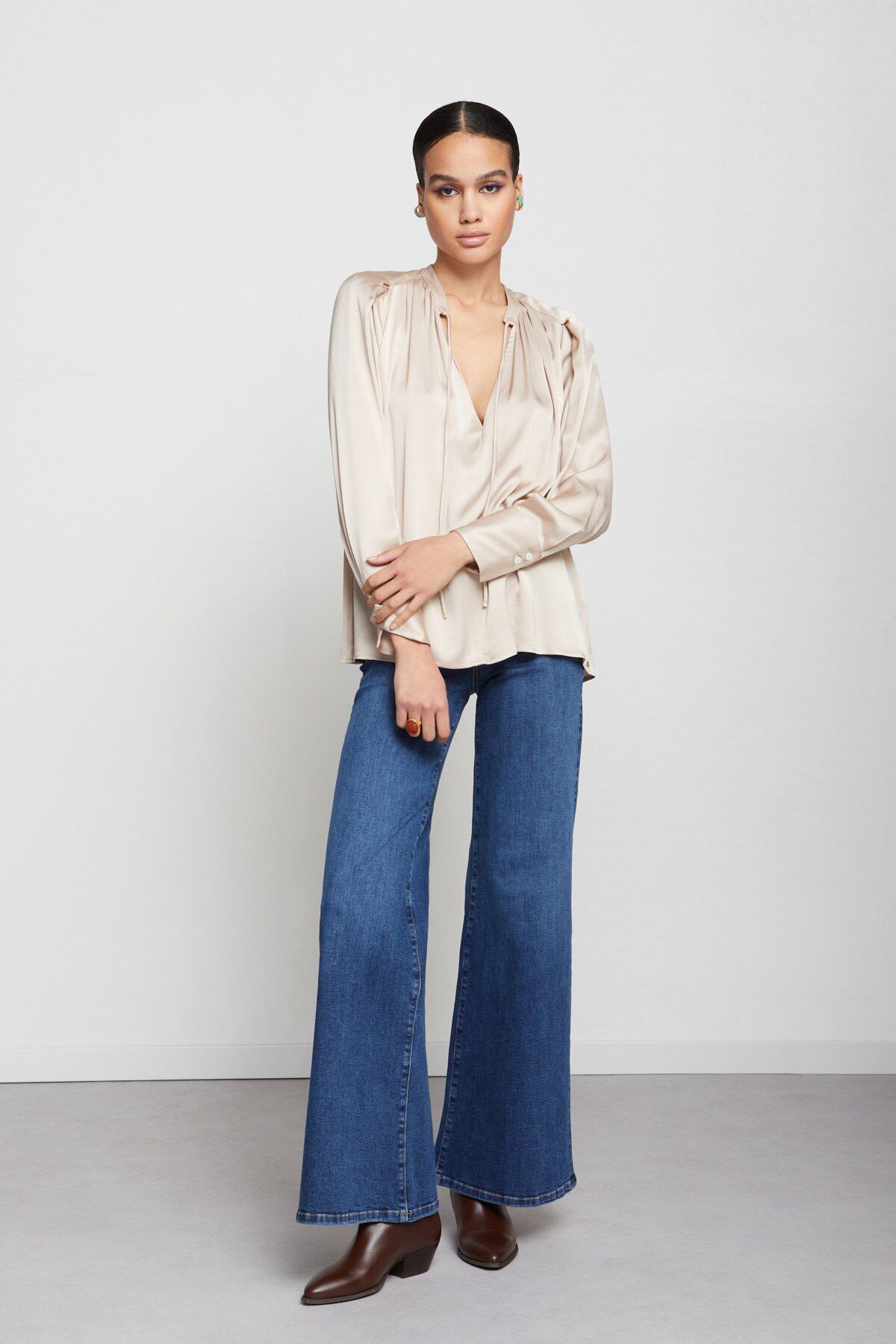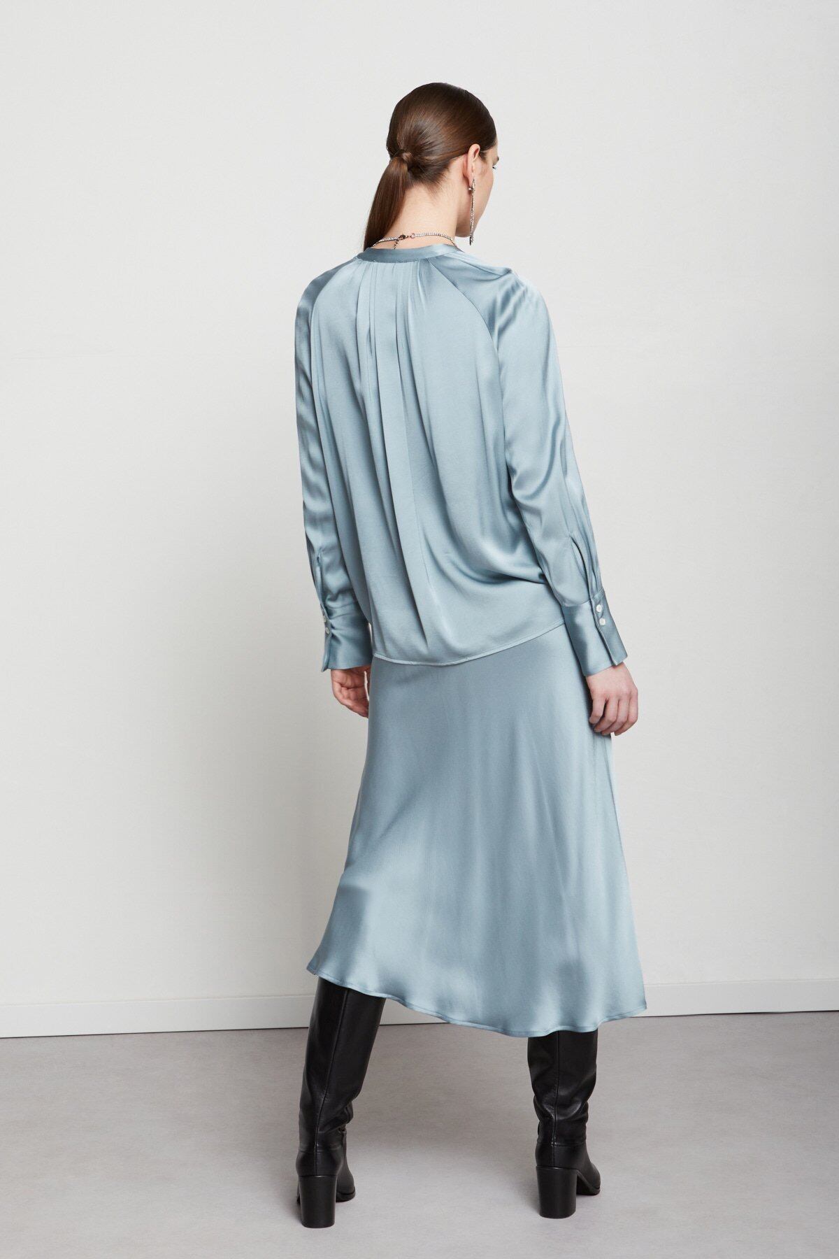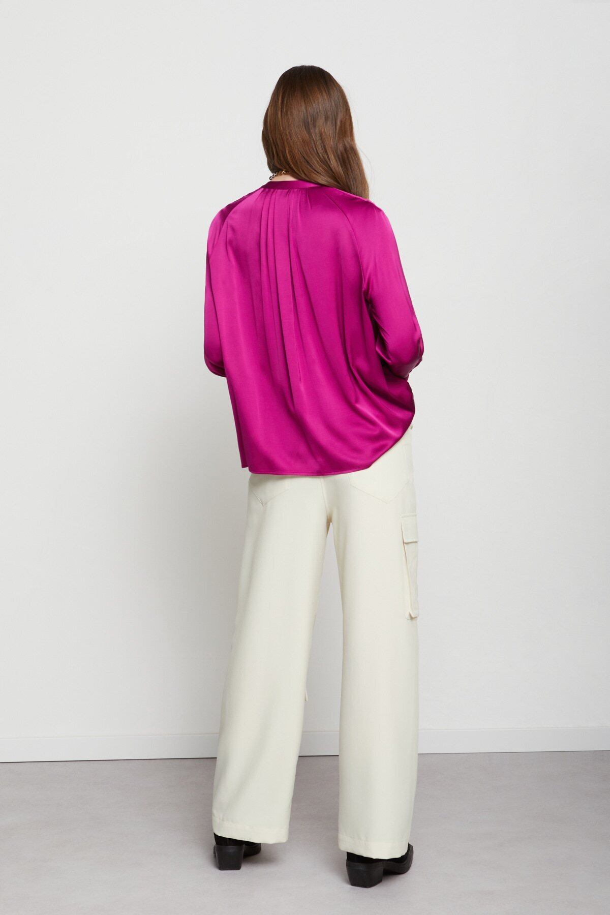 プリーツとストリング付きの V ネックを備えたピュア ビスコース ジャンパー フルード。