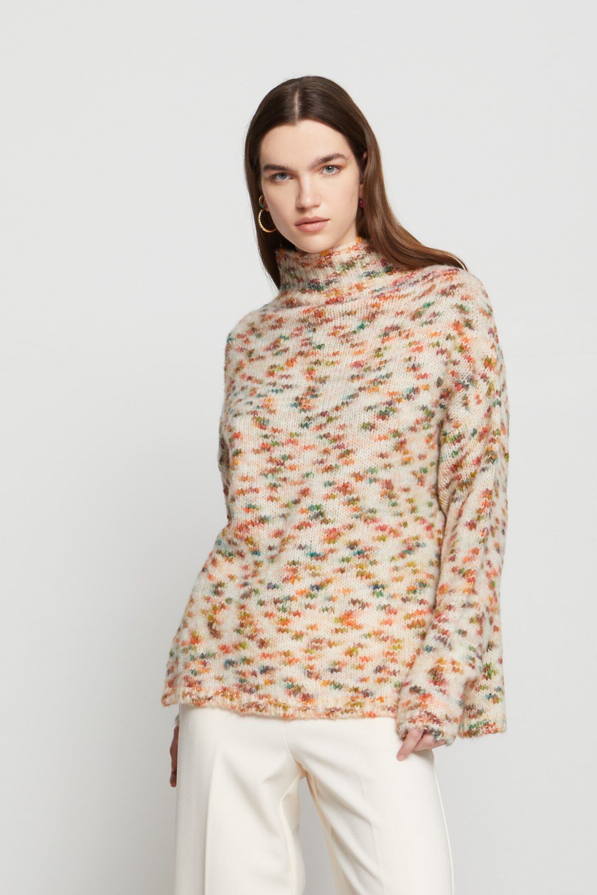 裾にスリットが入ったウール混紡のマルチカラーセーター。
