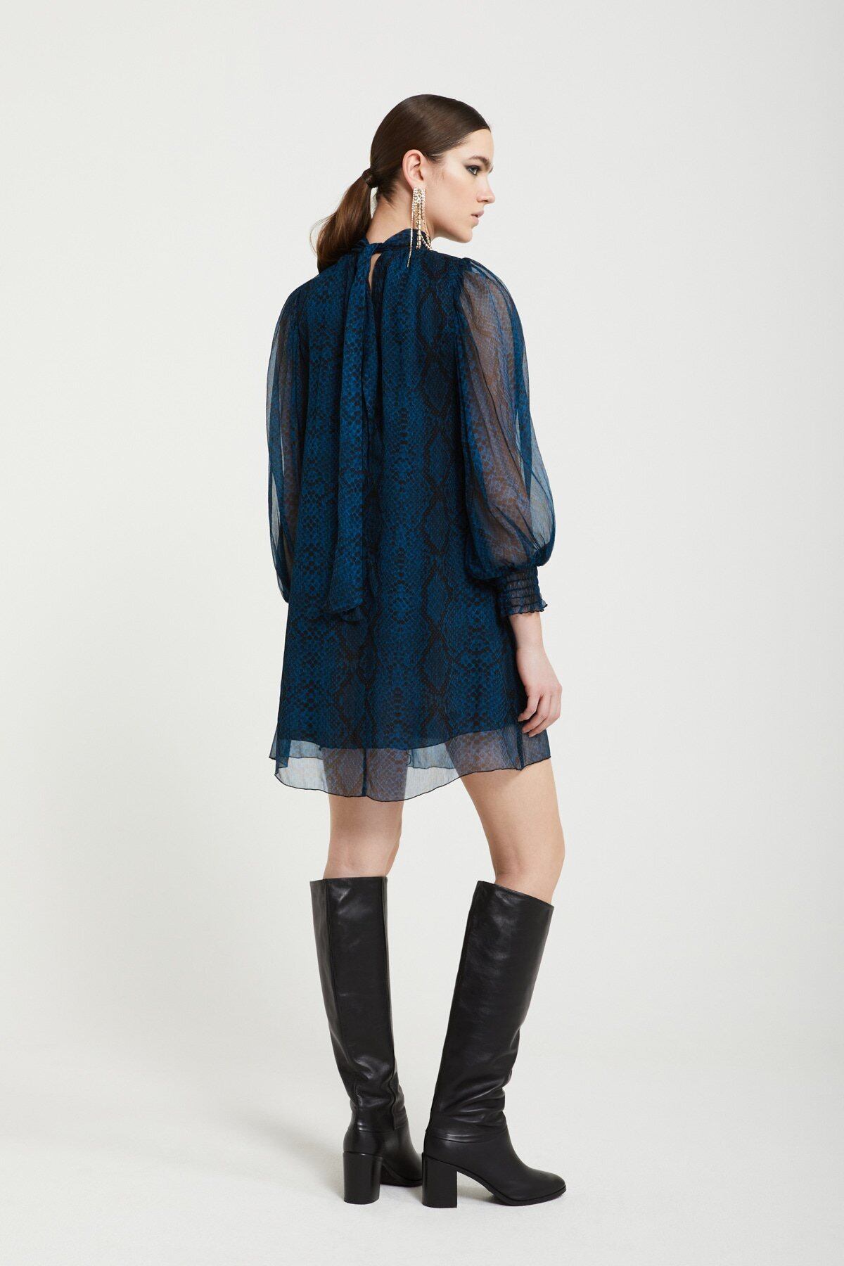 バルーンスリーブのピュアシルクのタートルネックショートドレス。
