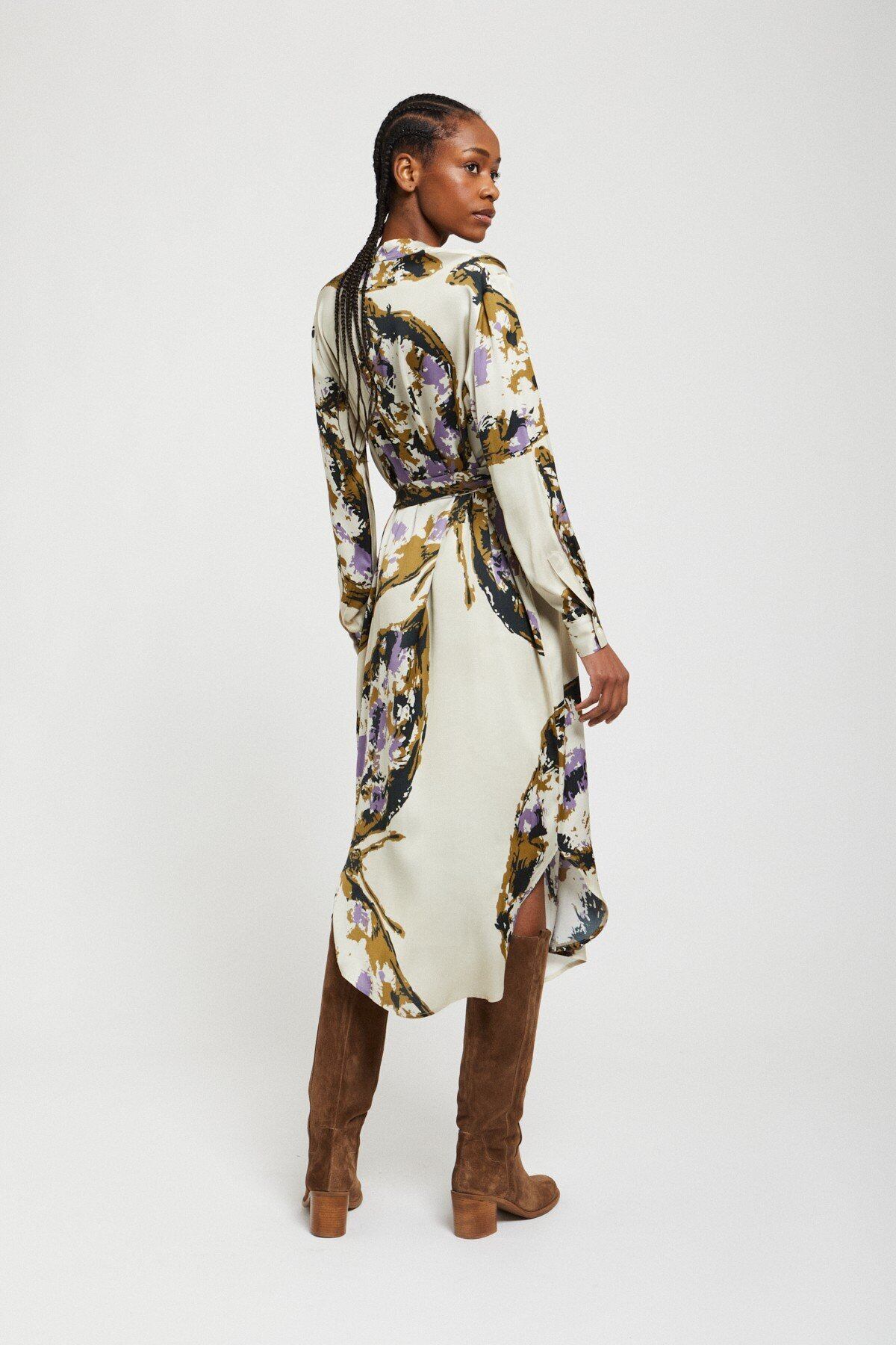 ボタン、サッシュ、が付いたプリントのピュアビスコースドレス。