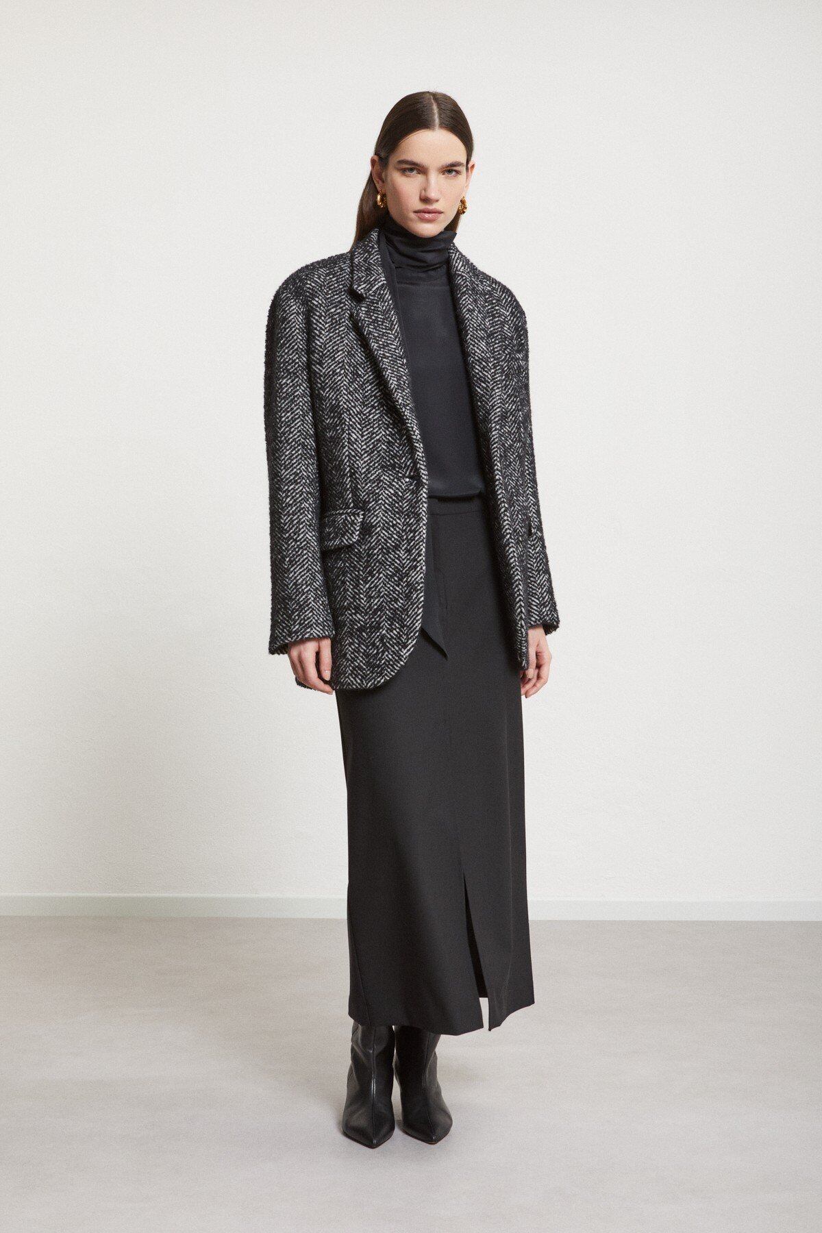 スリット入りウール混ストレートロングスカート。